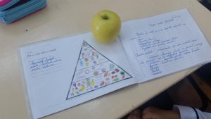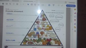 Fiecare elev a completat o fișă, reprezentând piramida alimentelor, si apoi au fost au expuse la expozitia clasei.
