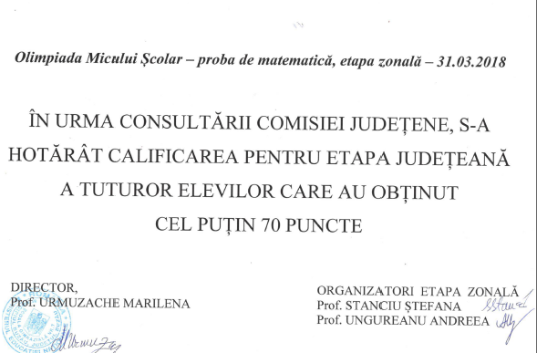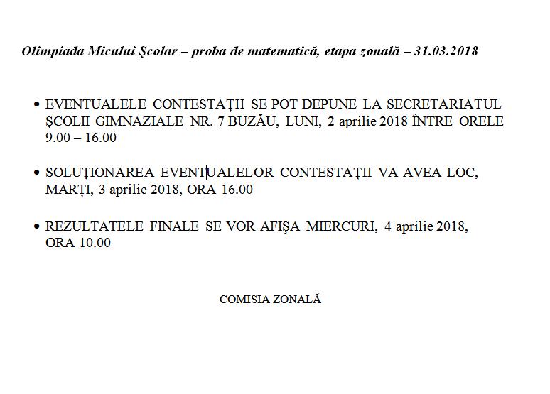 << În data de 24 martie 2018 se desfăşoară etapa zonală a Olimpiadei Micului Școlar pentru elevii claselor a IV-a, proba de Matematică, la Şcoala Gimnazială Nr. 7, Buzău.
